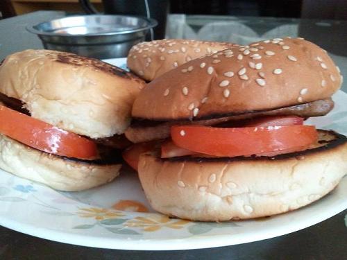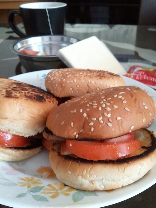 Tasty juicy beef burgers with cucumber and tomato slices, placed in a sesame seed bun. Add some slices of processed cheddar cheese and a bit of chili sauce… wonderful!